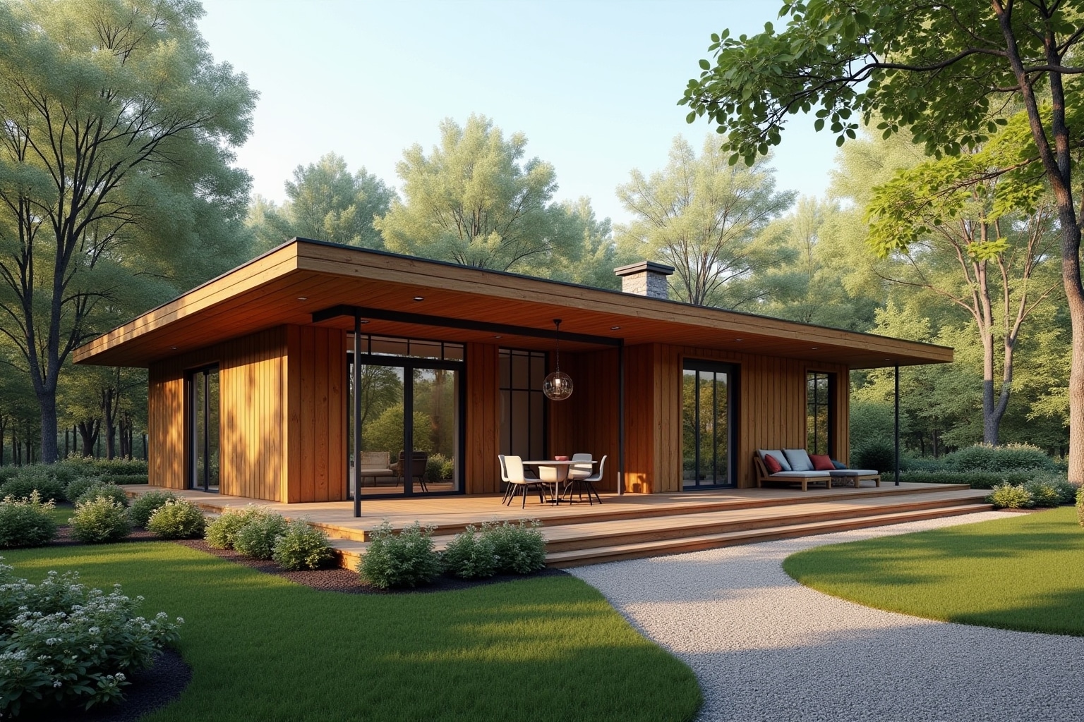 Klare Linien, geometrische Formen und eine puristische Ästhetik prägen diesen Stil. Hier wird oft auf sichtbare Holzstrukturen verzichtet und stattdessen eine glatte Holzfassade, beispielsweise aus Thermoholz, gewählt. Große Glasflächen und ein Flachdach unterstreichen den modernen Charakter.