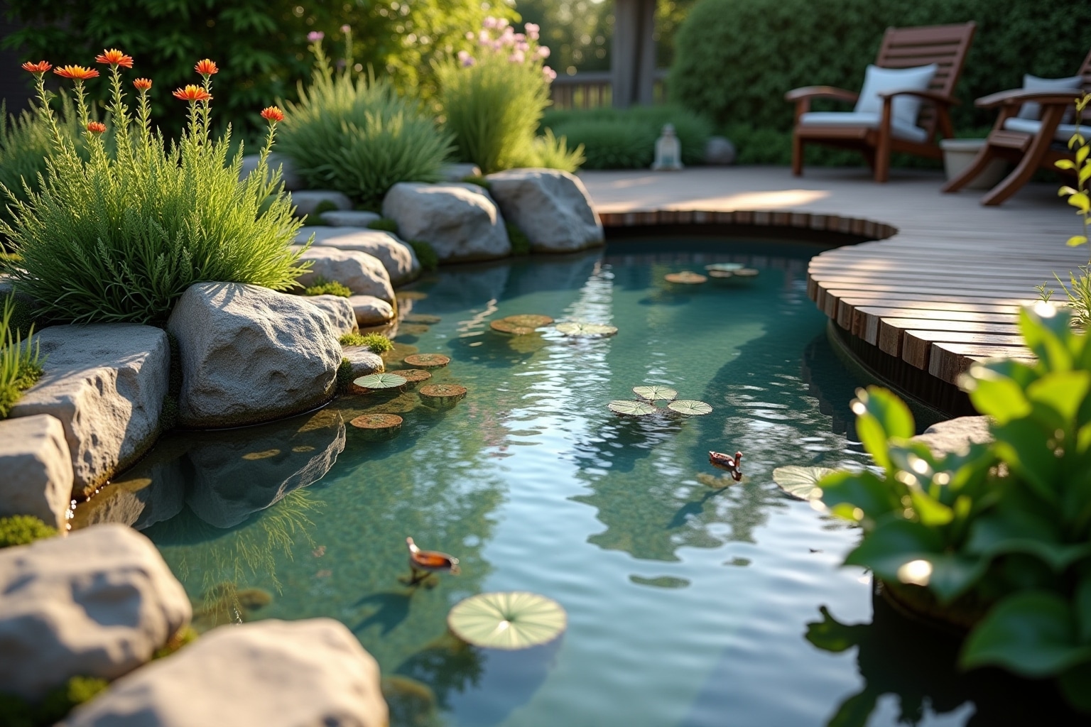 Die Bepflanzung ist nicht nur wichtig für die Optik deines Schwimmteichs, sondern auch für das ökologische Gleichgewicht. Pflanzen filtern das Wasser, produzieren Sauerstoff und bieten Lebensraum für Tiere. Wähle eine Mischung aus verschiedenen Pflanzenarten, die unterschiedliche Funktionen erfüllen. Sumpfpflanzen wie Schilf und Rohrkolben reinigen das Wasser, Unterwasserpflanzen wie Hornkraut und Tausendblatt produzieren Sauerstoff und Seerosen bieten Schatten und Schutz für Fische.